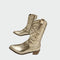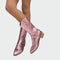 Dámské **kovbojské boty v metalické růžové** barvě, které upoutají pozornost svým jedinečným charakterem. Mají **bohatě vyšívaný design** a boční zip pro snadné obouvání, zatímco nízký dřevěný podpatek poskytuje pohodlí a styl s každým krokem. Ideální pro odvážné street-style vzhledy a módní prohlášení, která se vyjímají.