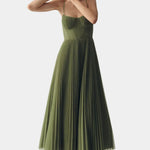 Ukažte svou eleganci a ženskost s těmito ohromujícími zelenými midi šaty, které mají jemné ramínka a plisovanou sukni. Přiléhavý korzet na vrchu zajišťuje dokonalé přizpůsobení a styl, zatímco pohyb sukně dodává každému vzhledu nádech luxusu.