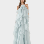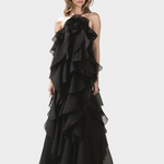 Tyto ohromující dlouhé šaty v teplé terakotové barvě vyzařují luxus a romantiku. Navrženy s vícevrstvými volány z lehkého a vzdušného materiálu, vytvářejí impozantní pohyb s každým krokem, který uděláte.