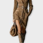 Otočte hlavy v těchto stylových semišových šatech s páskem, které kombinují eleganci s nádechem westernového stylu. Jejich měkká textura, strukturovaný silueta a lichotivý pásek v pase z nich činí nadčasový kousek pro jakýkoli stylový šatník.