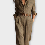 Ovládněte svůj den s nadčasovou sebevědomostí v tomto Upraveném kostkovaném overalu s páskem — kde se setkává klasický styl inspirovaný pánskou módou s bezstarostnou ženskostí.