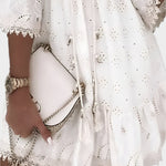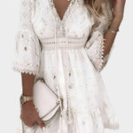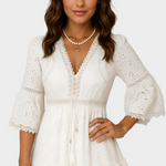 Přijměte nadčasovou eleganci s těmito krásně navrženými krajkovými mini šaty. Mají jemnou vyšívanou krajku, ženský výstřih do V a široké rukávy – ideální pro zvláštní příležitosti, letní rande nebo svatební vystoupení.