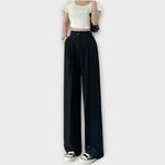 Vstupte do bez námahy elegantního stylu s těmito přizpůsobenými kalhotami s vysokým pasem a širokými nohavicemi, navrženými tak, aby prodloužily vaši siluetu a zvýšily váš styl. Vyrobeny s hladkým, splývavým drapérií a čistým minimalistickým střihem, přinášejí nadčasovou eleganci jak pro neformální, tak pro rafinované vzhledy.