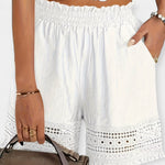 Lehké a ženské, tyto letní šortky kombinují romantický detail krajky s praktičností kapes. Jejich lehký design a jedinečná textura je činí ideálními na procházky, dovolené a uvolněné letní chvíle.