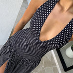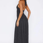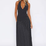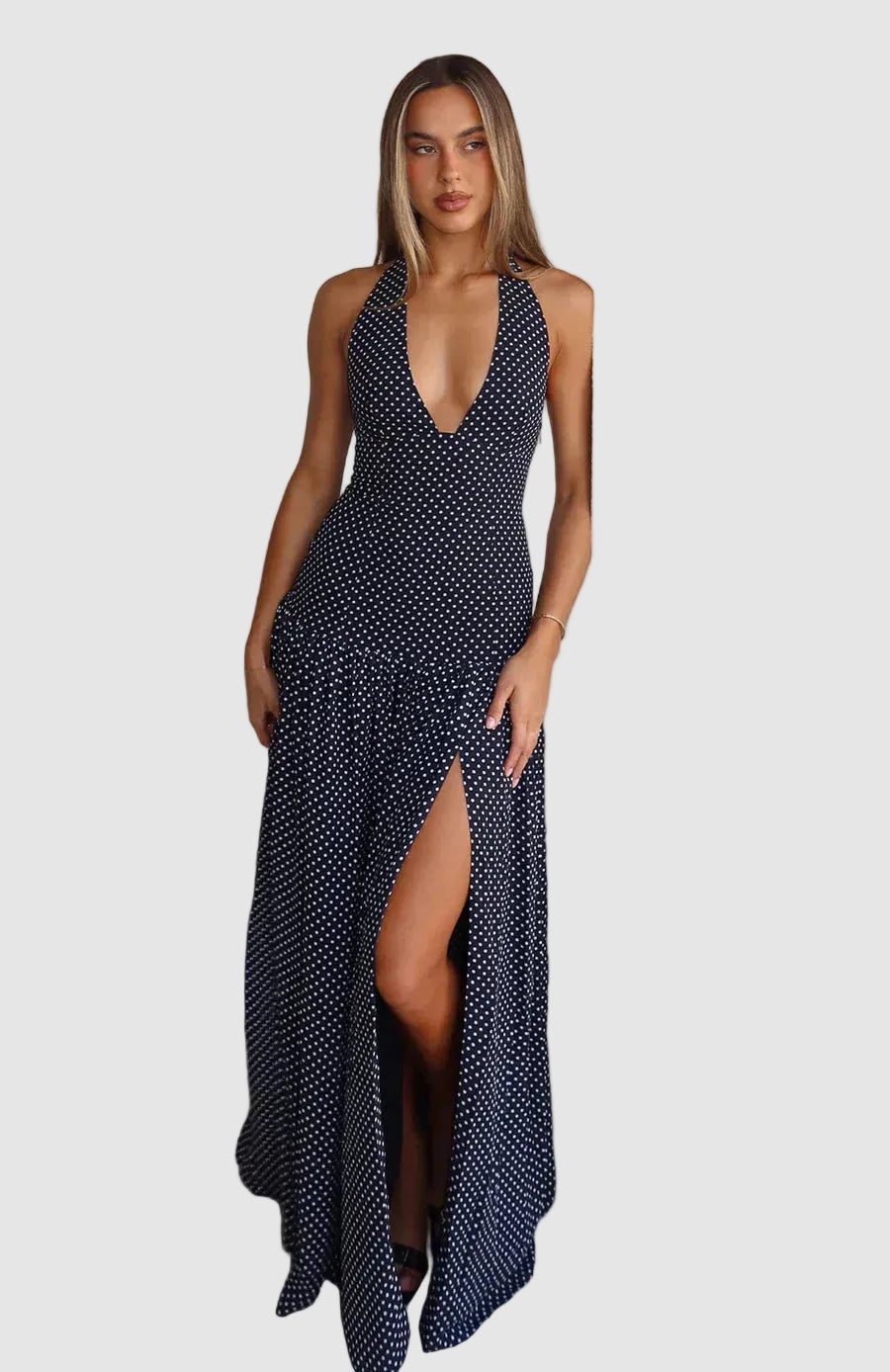 Toto jsou šaty, které si nikdy nebudete chtít sundat. S hlubokým halter výstřihem, otevřeným zády a vzdušným bočním rozparkem je střih odvážný, lichotivý a stvořený pro slunečné dny. Pás je umístěn přesně tak, jak má být — elegantní, bez námahy a navržený tak, aby se s vámi pohyboval.