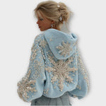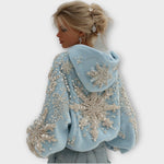 Zářte během sváteční sezóny v této úžasné ručně zdobené mikině, navržené s třpytivými perlami a krystalovými akcenty, které připomínají čerstvě napadaný sníh. Pohodlná a přitom okouzlující, je to dokonalý kousek pro vánoční oslavy, zimní úniky a kouzelné zasněžené noci.