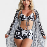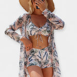 Tento moderní set kombinuje pohodlí, styl a eleganci pro kompletní letní vzhledy. Bikiny s vysokým pasem obepínají siluetu, top s mašlí zvýrazňuje dekolt, zatímco lehký plážový přehoz dodává jemnost a všestrannost.