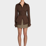 Ukažte svou eleganci a dynamiku s touto čokoládovou košilí s překládaným designem, doplněnou o sukni s mini kostkovaným vzorem. Vytříbený design s překládem v pase zvýrazňuje siluetu a nabízí vzhled, který spojuje ženskost a profesionalitu.