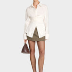 - Design: košile s překládaným detailem a elegantními sklady v pase