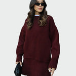 Souprava, která kombinuje eleganci a pohodlí s uvolněným střihem. Její jemná textura poskytuje příjemný pocit, zatímco minimalistický design ji činí ideální pro každodenní nošení i pro speciální příležitosti. Nadčasový kousek, který s jemností doplní jakýkoli outfit.