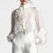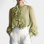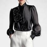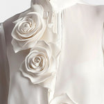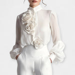 Tato bílá blůza s úchvatnými 3D aplikacemi růží pozvedne váš styl s nádechem romantiky a luxusu. Vysoký límec a jemně průhledná tkanina poskytují vzdušný, sofistikovaný siluetu, ideální pro kombinaci s elegantními kalhotami nebo sukněmi.