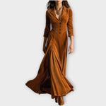 Vstupte do nadčasové romantiky s těmito vintage inspirovanými sametovými maxi šaty, navrženými s lichotivým přiléhavým pasem a dramatickou volnou sukní. Knoflíkový korzet a upravený klopový límec dodávají sofistikovaný nádech, což je činí ideálními pro podzimní akce, večerní setkání nebo elegantní každodenní nošení.